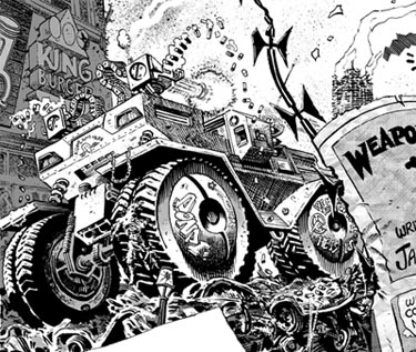 Haw haw! I know about car problems; my ’95 Roadmaster Estate is in “problem of the week” mode lately. Fortunately this dragon is a mean mechanic! Speakin’ of cool machines, that chain cannon toting off roader there turns me on! Oops, just accidentally spilled some gun oil in my crotch; better deal with that…