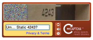 What are you up to, Captcha??? by JY on June 5, 2014 at 11:57 am Posted In: Blogginz If you try to post comments on my web site, beware! Captcha is really about fucking with your head today! └ Tags: captcha, madness, static