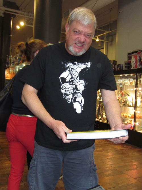 | I thought Mark here was Hulking out, trying to tear up my phonebook-sized tome! Actually, he was stroking out! (Sorry I didn’t call the paramedics faster, Mark! You look good with half your face paralyzed, though…) |