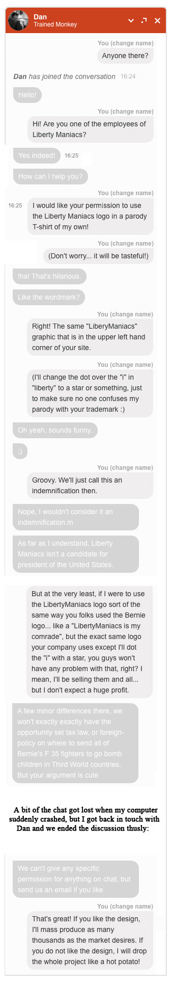 You edited out the portion in the chat where I stated that you don’t need my permission to do a legal parody of Liberty Maniacs. You don’t. Nobody is going to stop you, though I’m sure you can come up with a better slogan below than “Tees funny enough for a Leno fan.†But again, that could be hilarious to some of your readers, just as Liberty Maniacs fans dig the Bernie bit. (You also edited out the portion where I enthusiastically gave you the means to contact us and send your idea.)