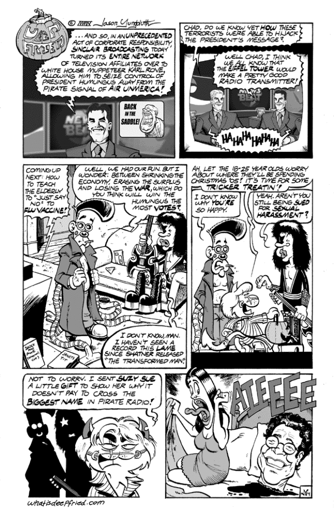 Pirate Radio by JY on October 13, 2004 at 4:04 pm Chapter: 3 Air Unmerica └ Tags: Beepo, Deep Fried, george bush, Jason Yungbluth, Karl Rove, Roadkill 1 Comment