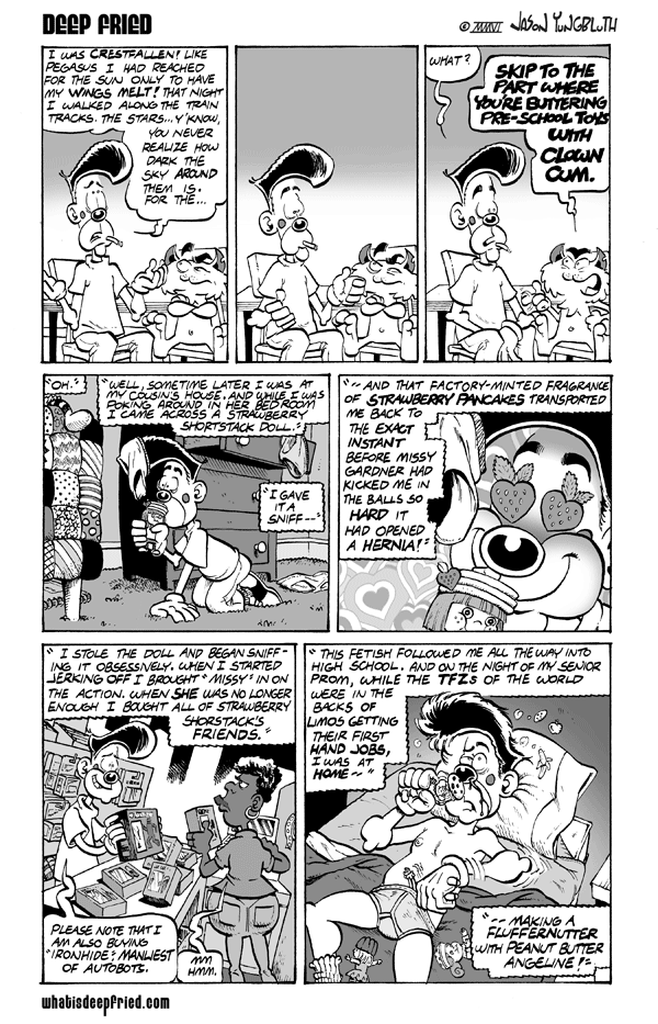 No, you haven’t forgotten to take your meds. Beepo and Roadkill are back to fill your lives with more love than an ecstasy frosted Care Bear. “Scent of a Pancake” first ran in Deep Fried volume 2 #2. In my[…]↓ Read the rest of this entry…