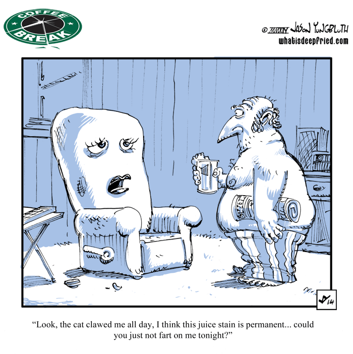 Coffee Break: Love Seat by JY on January 10, 2014 at 12:00 am Chapter: COFFEE and CREAM └ Tags: chair, comic, fat guy, Jason Yungbluth, wife