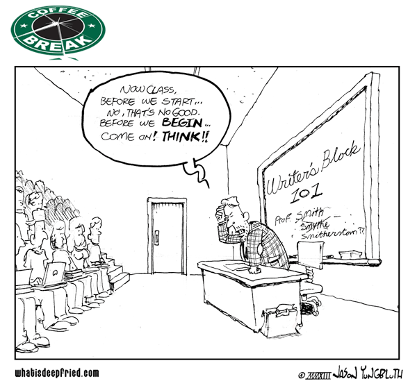 Funny. But why on earth would anyone teach an entire course on writer’s block? The blackboard should read: How to Overcome Writer’s Block. I’d explain further, but I’m stuck —