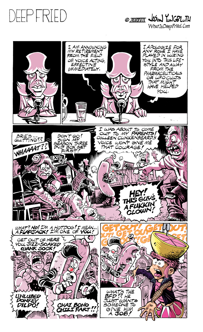 A) a clown having spent the night in the gutter reeking of booze B) dressed in a wiener suit C) attends a con(vention) for breakfast idols free of charge D) publicly inquires into the morality of his desire to engage in an explicit, breakfast themed sex act with an underage, handicapped girl, which E) leads to a voice actress taking personal responsibility and retiring from the scene, leading to F) a lynchmob ineffectually held back by a grapefruit, as G) the clown is for once not backed up by a satanic cat.