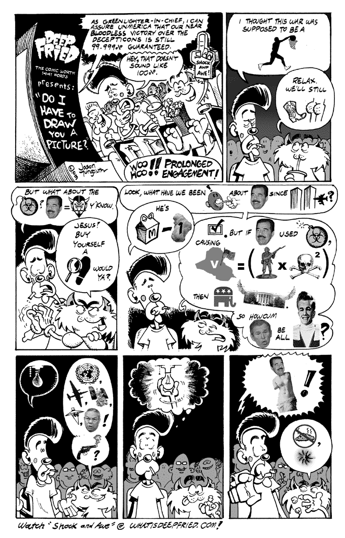 Do I Have To Draw You a Picture? by JY on March 26, 2003 at 2:14 pm Chapter: 1 Mixed Nutz └ Tags: Beepo, comic, Comics, Deep Fried, Iraq, Jason Yungbluth, Roadkill, Saddam