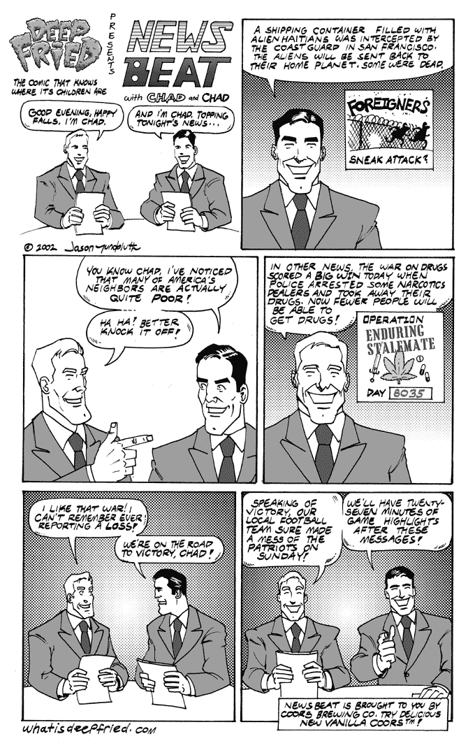 Enduring Stalemate by JY on December 7, 2002 at 11:48 am Chapter: 1 Mixed Nutz └ Tags: Beepo, Chad, Deep Fried, Jason Yungbluth, News Beat, Roadkill