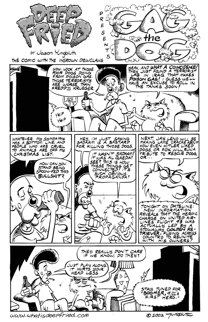 Gag the Dog by JY on August 21, 2002 at 11:32 am Chapter: 1 Mixed Nutz └ Tags: 9/11, Beepo, Deep Fried, dogs, Jason Yungbluth, propaganda, Roadkill