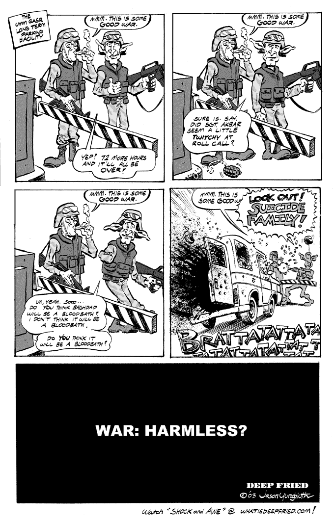 Good War by JY on April 2, 2003 at 2:15 pm Chapter: 1 Mixed Nutz └ Tags: Beepo, Bush, comic, Comics, Deep Fried, Dubya, Iraq, Jason Yungbluth, Roadkill, Rumsfeld