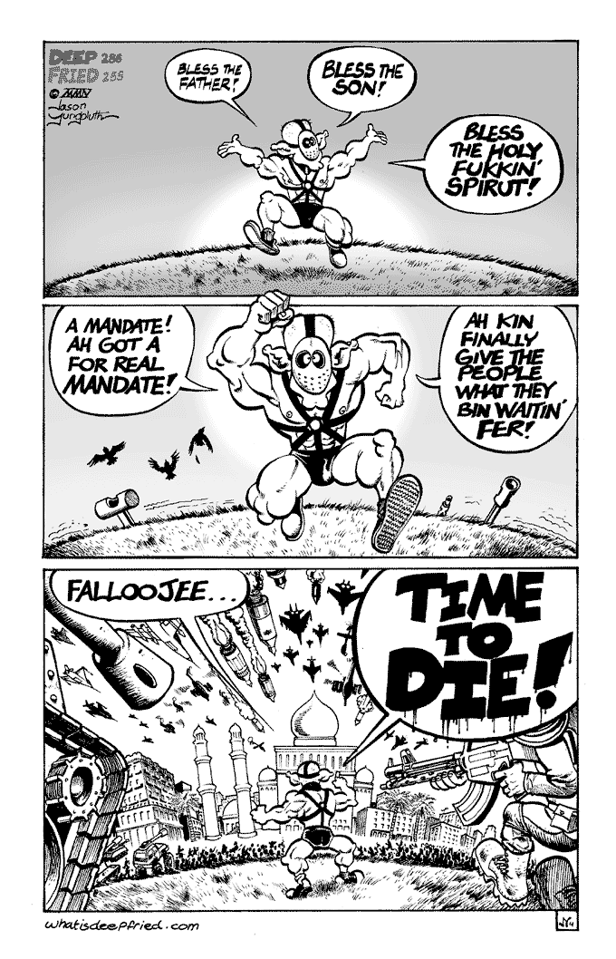 Holy War by JY on November 10, 2004 at 4:08 pm Chapter: 1 Mixed Nutz └ Tags: Beepo, Deep Fried, Falluja, george bush, Jason Yungbluth, Roadkill