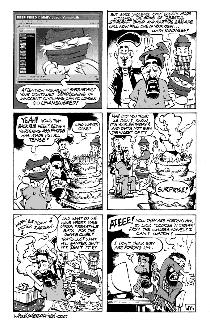 Hugs, Not Thugs by JY on June 30, 2004 at 3:40 pm Chapter: 1 Mixed Nutz └ Tags: Beepo, Deep Fried, Jason Yungbluth, Roadkill, terrorism