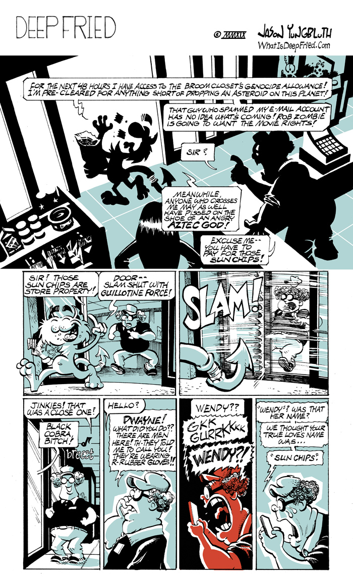 Kiss & Makeup 3 by JY on April 1, 2019 at 12:25 pm Chapter: 12 Kiss and Makeup └ Tags: comic, Comics, Gene Simmons, humor, Jason Yungbluth, kiss, MAD Magazine, Roadkill, Sun Chips