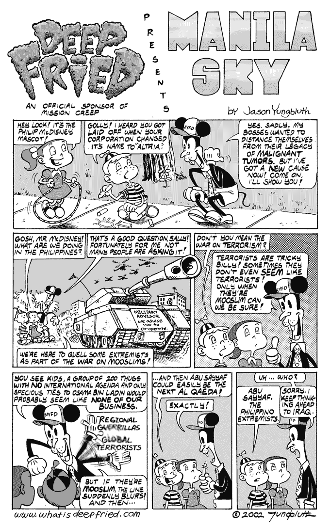 Manila Sky by JY on February 8, 2002 at 11:16 am Chapter: 1 Mixed Nutz └ Tags: Beepo, Deep Fried, Jason Yungbluth Philip McDisney, Roadkill