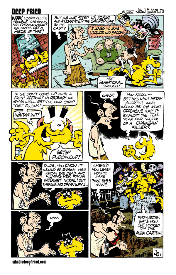 Moohamed by JY on February 13, 2006 at 11:48 am Chapter: 5 Death of Beepo └ Tags: Beepo, cartoon riots, Deep Fried, Jason Yungbluth, mohammed, Roadkill, tom toles, torso
