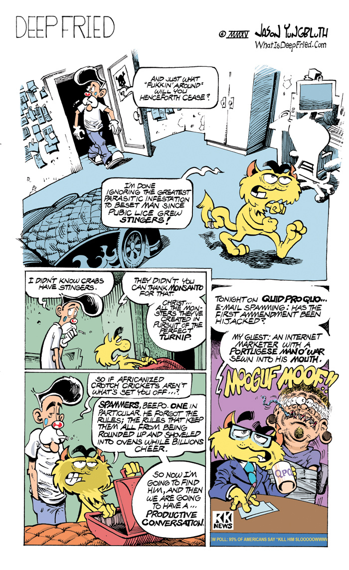 Out of the Frying Pan 27 by JY on September 7, 2015 at 12:00 am Chapter: 10 Frying Pan └ Tags: Beepo, internet, Roadkill, Spammers