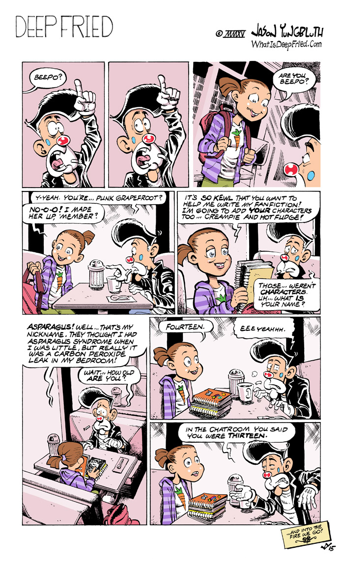 I have several projects ready to begin in 2016, and I would like to make the next arc of Deep Fried (which I am tentatively calling The Hero’s Journey) one of those projects. I’d also like to return to a regular schedule, now that PEEK! is about to hit the shops and I have time to waste time once more. So, if you want to see where this adventure is taking us all, please do the following: