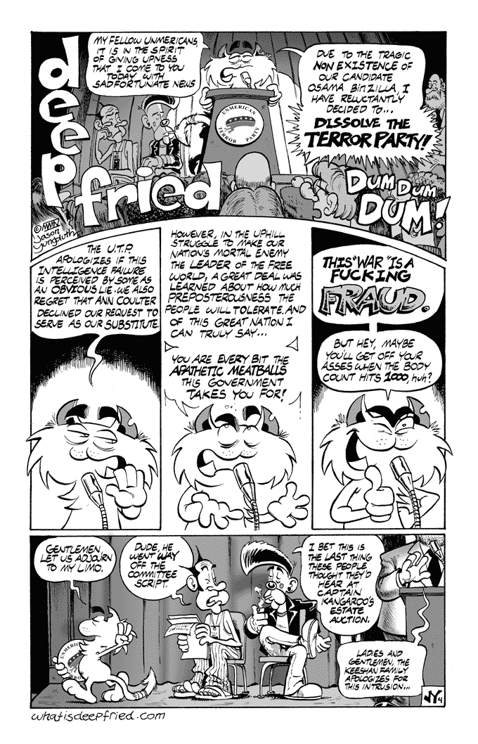 Party’s Over by JY on February 3, 2004 at 3:17 pm Chapter: 2 Terror Party └ Tags: Beepo, Deep Fried, Jason Yungbluth, political party, Roadkill, terror