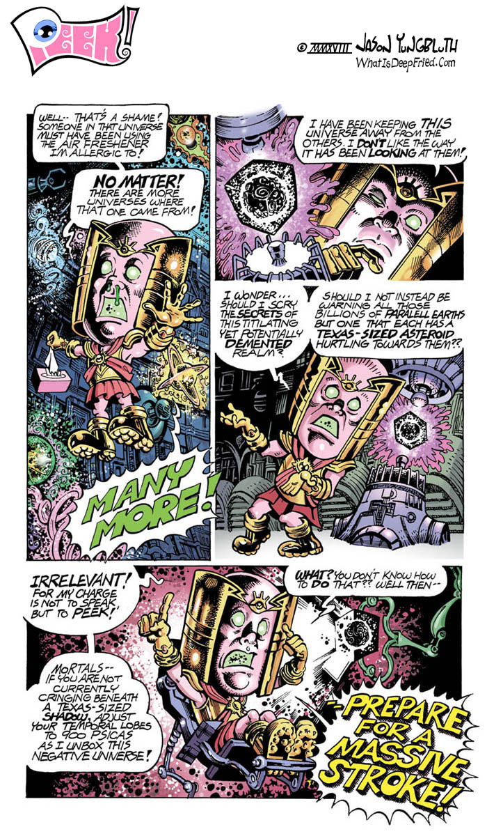 Peek the First 3 by JY on February 28, 2018 at 12:00 am Chapter: 1 Peek the First └ Tags: Clarissa, comic, homor, Marvel, parody, peek, peeker, sci-fi, super friends, Watcher, yungbluth