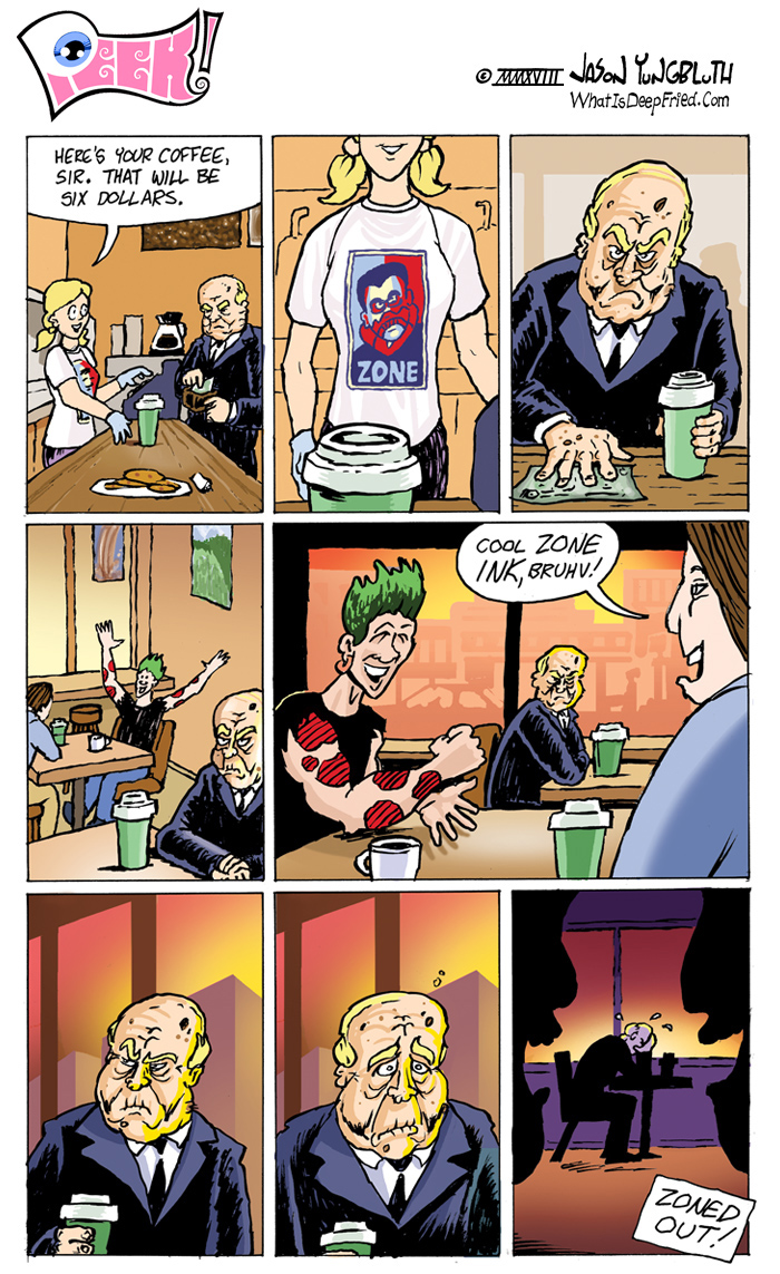 Peek the Second 20 by JY on September 10, 2018 at 12:00 am Chapter: 2 Peek the Second └ Tags: 1980s, 80s, cartoons, comic books, Dirk Courage, Jason Yungbbluth, MAD Magazine, parody, peek, Spiral Zone