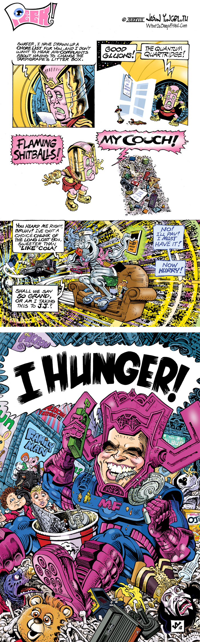 Peek the Second 31 by JY on November 26, 2018 at 12:00 am Chapter: 2 Peek the Second └ Tags: 80s, comedy, couch surfer, Jason Yungbluth, parody, peek, sci-fi, Silver Surfer, Weapon Brown