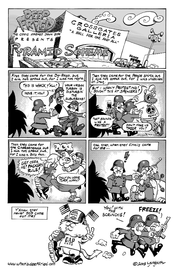 Pyramid Scheme by JY on March 11, 2003 at 2:12 pm Chapter: 1 Mixed Nutz └ Tags: Beepo, comic, Deep Fried, Jason Yungbluth, malls, nazi, Roadkill
