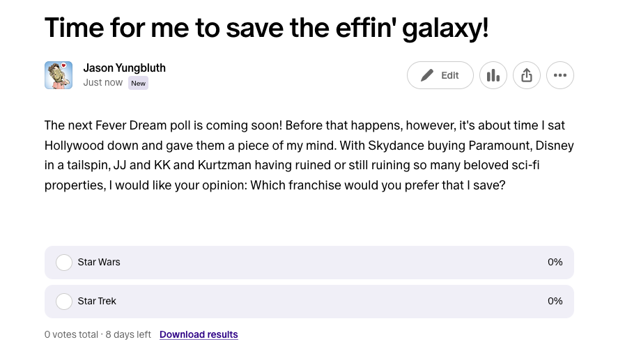 JY: You need to subscribe to my Patreon to vote. (It’s free tho’!)