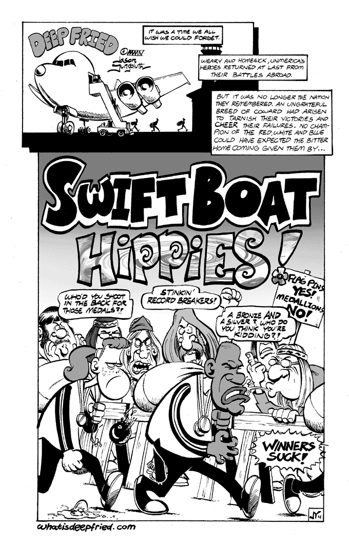 Swift Boat Hippies by JY on September 1, 2004 at 3:57 pm Chapter: 1 Mixed Nutz └ Tags: Beepo, Deep Fried, Jason Yungbluth, Roadkill, Swift Boat