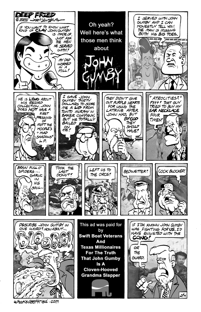 Swift Kick in the Boat by JY on August 11, 2004 at 3:53 pm Chapter: 1 Mixed Nutz └ Tags: Beepo, Deep Fried, Jason Yungbluth, John Kerry, Roadkill, Swift Boat