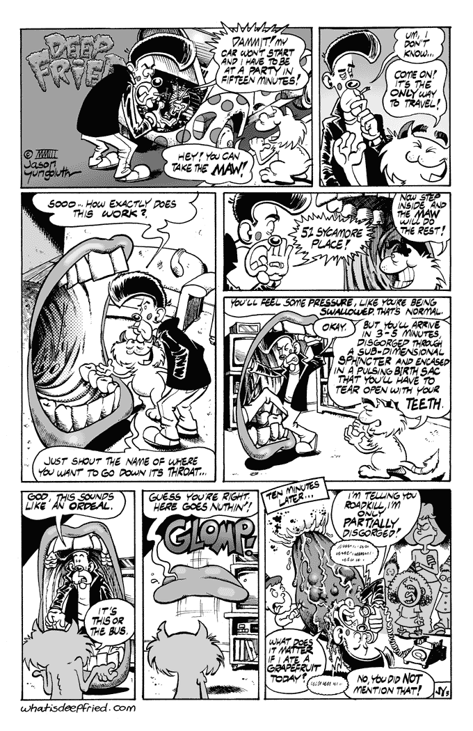 The Maw by JY on September 2, 2003 at 2:34 pm Chapter: 1 Mixed Nutz └ Tags: Beepo, comic, Comics, Deep Fried, Jason Yungbluth, maw, mouth, Roadkill
