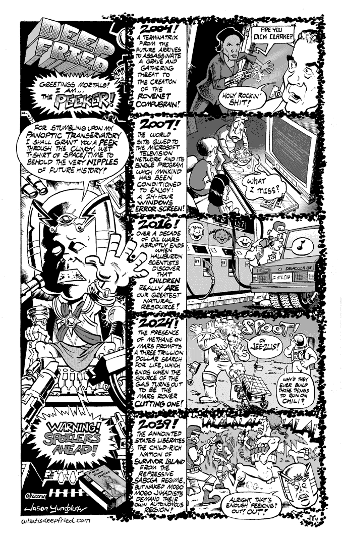 The Peeker by JY on April 7, 2004 at 4:19 pm Chapter: 1 Mixed Nutz └ Tags: Beepo, Deep Fried, Jack Kirby, Jason Yungbluth, Roadkill