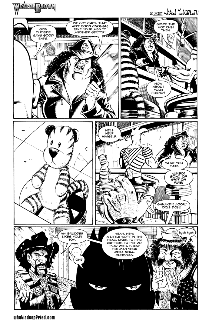 BTW, I went back in the archives to see how this storyline ended, and I can't find it. Am I looking in the right place or has the old Weapon Brown comics been taken down to encourage fans to get the new trade? (If it's the latter, I'm cool with that. Besides, there are nearly 200 Weapon Brown comics currently up on this web site.)