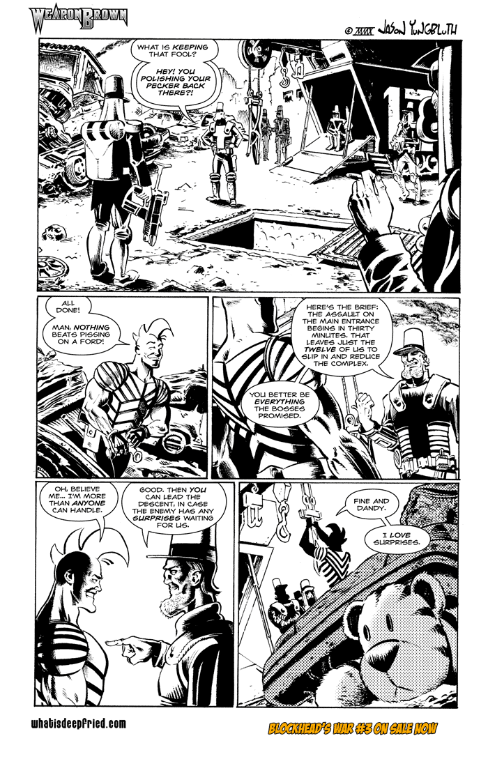 Jason, I gotta admit I’m a little letdown by C.A.L’s dialogue thus far. Being based off a guy who once used the phrase, “A pair o’ pathetic paripatetics,” it doesn’t make sense that his grown-up version is is so simple. Charlie Brown was always more basic, so having his weaponized version be gruff and murderous makes sense. But C.A.L. needs to be more fancy and sadistic in both his words and actions to suit the elaborate schemes of his inspiration. Also, we missed a chance for him to say he was Stupendous, or the like…