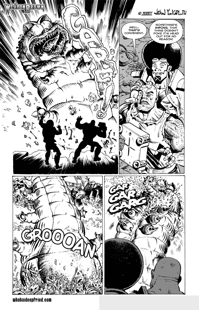 Side plot: Hugie’s developing man-crush on WB influence the CAL shmoo to grow in the same admiration, thus cementing Weapon Brown as King and ruler of the new society… Yet as long as the Syndicate exists, WB still wears his crown upon a troubled brow…