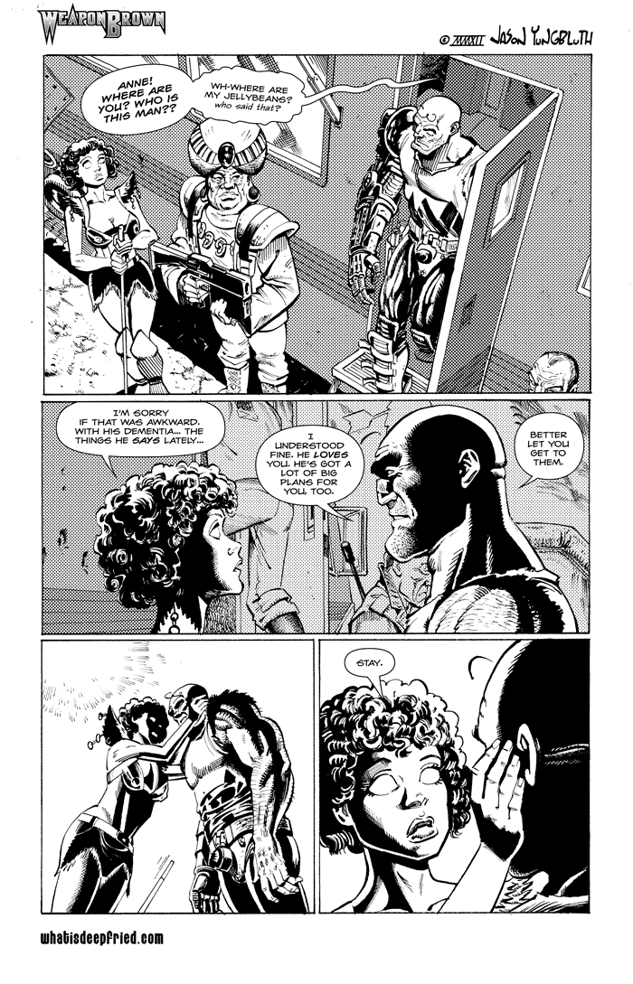 He’s being offered a chance not many in this barren world get. He’s most likely not going to accept it but that is the way of the hardened wasteland warrior. Scrapping and surviving is all he’s known. This is the first Weapon Brown strip I’ve read that’s made me feel genuinely sad. If the world does get put back together, what’s left for him? I can’t even make a Captcha joke…