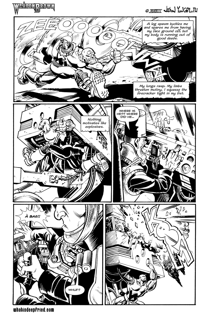I am hoping to attend Dragon Con this year, and though Blockhead’s War is taking far longer than I ever imagined in my most mushroom altered dreamtrips, I will have the first two issues ready when I arrive. Originally it was to be a 2-issue series, but it now looks like it will be three. The Weapon Brown collection, however, cannot help but be ready for next year’s show.