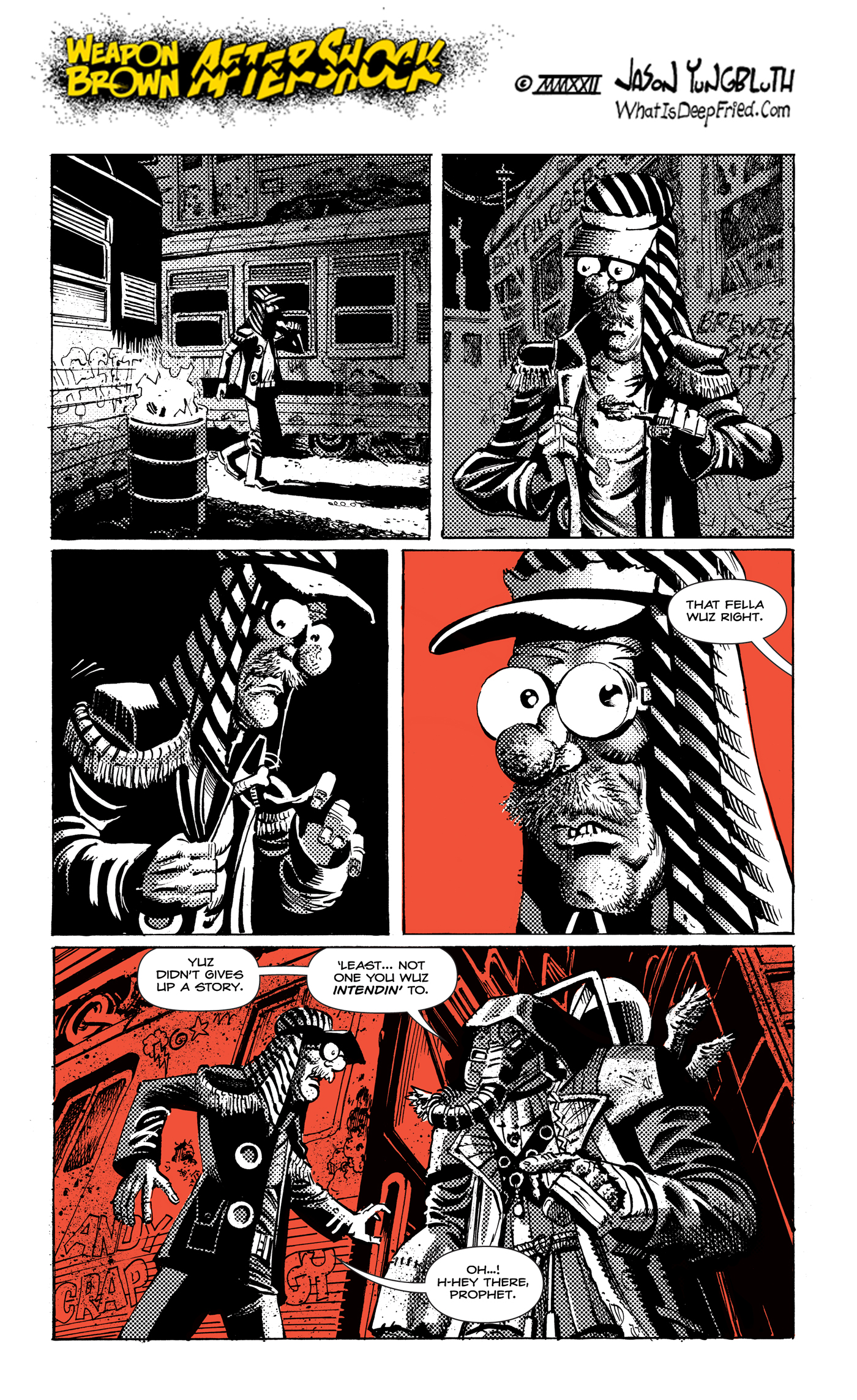 Weapon Brown Aftershock 108 by JY on January 21, 2022 at 4:28 pm Chapter: 12 Aftershock My subscribers’ goodies drive them bananas! └ Tags: apocalypse, cartoon, charles schulz, Charlie Brown, comic, Frank Miller, Jason Yungbluth, New Year's, post-apocalyptic, Sin City
