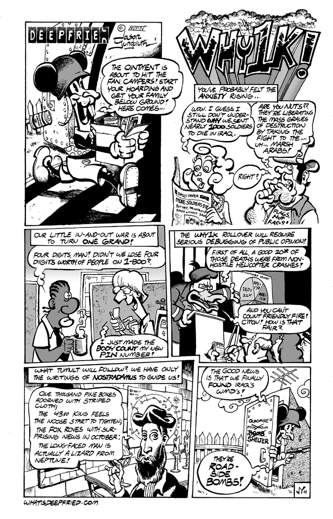 Why1K? by JY on August 25, 2004 at 3:55 pm Chapter: 1 Mixed Nutz └ Tags: Beepo, Deep Fried, Iraq, Jason Yungbluth, McDisney, Roadkill