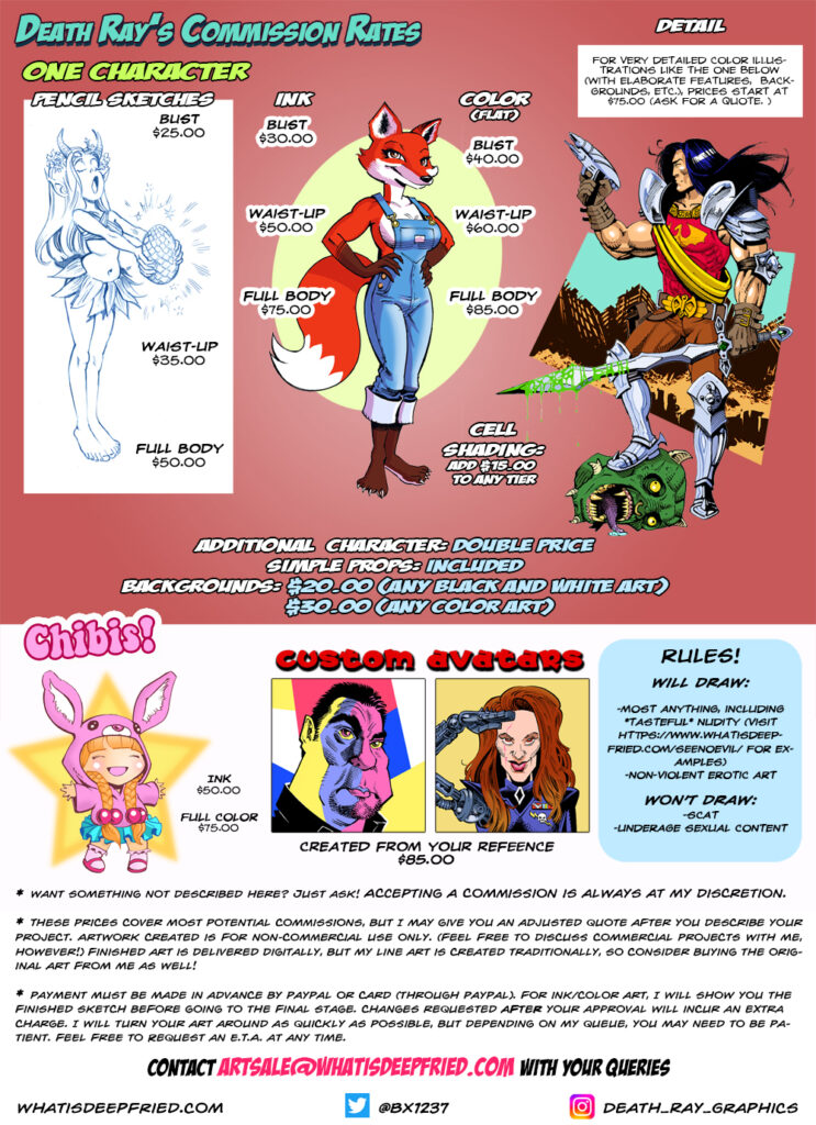 I am ready and willing to draw just about anything you can imagine! Below are my digital commission rates. For even more examples of my artwork and styles, click here.