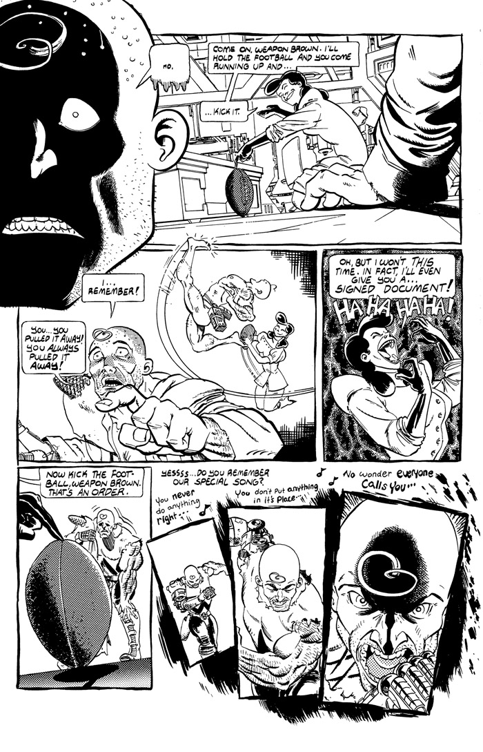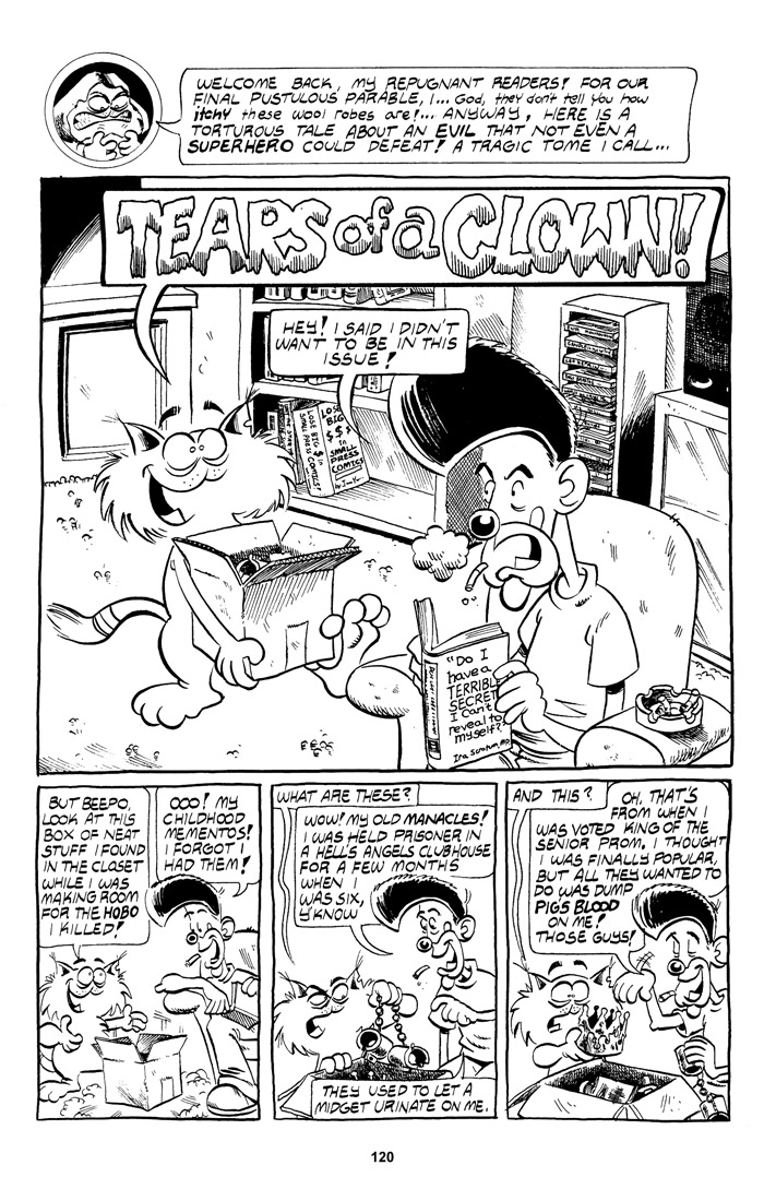 The complete first volume of Deep Fried, collected in an easy to hold paperback! This 128-page trade includes all the material from the original Deep Fried issues #1-4, and features the debut of Beepo and Roadkill, Clarissa and Weapon Brown’s original story arc! Enjoy fan favorite stories like “No Justice, No League!” and “Stuffed Friend”, and bonus content such as the gruesome “Henderson Saves Face” and a stylin’ Weapon Brown pin-up by cartoonist Phil Hester (Green Arrow, The Wretch)! No library or book-burning is complete without it!