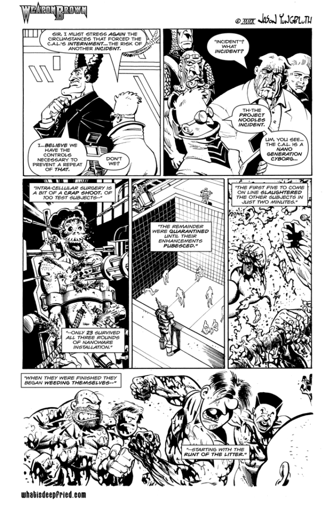 Weapon Brown 161 by JY on October 29, 2013 at 12:00 am Chapter: 7 Prestige └ Tags: Bluto, Bull Bushka, CAL-v1N, Derrick, Dilbert, Lyman, Moe, Noodle Incident, Prune Face 29 Comments
