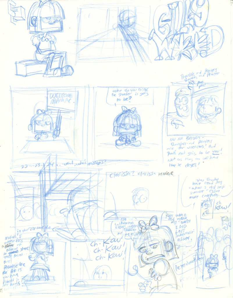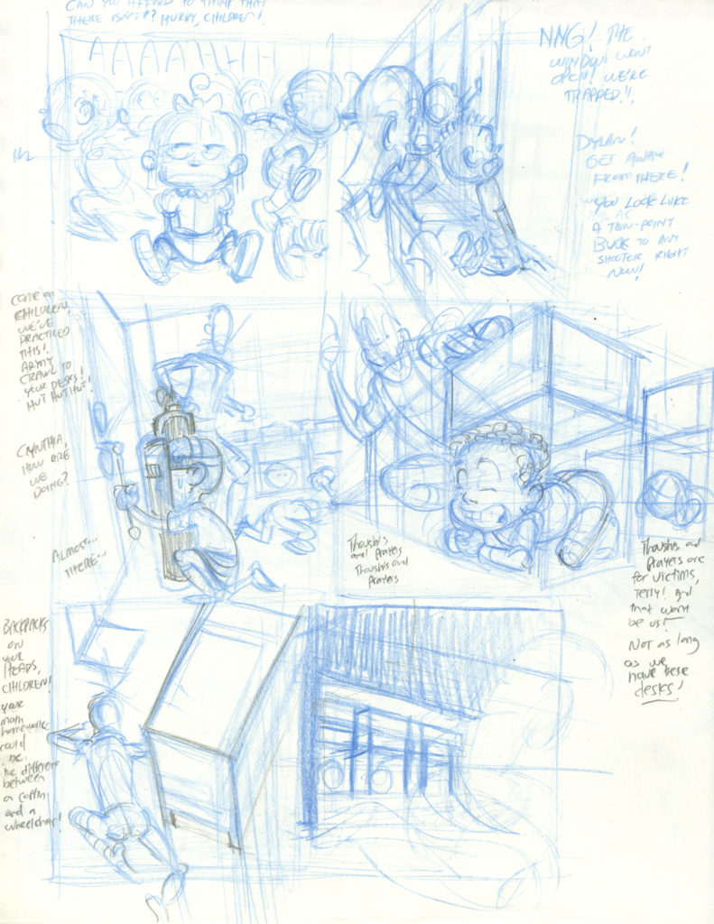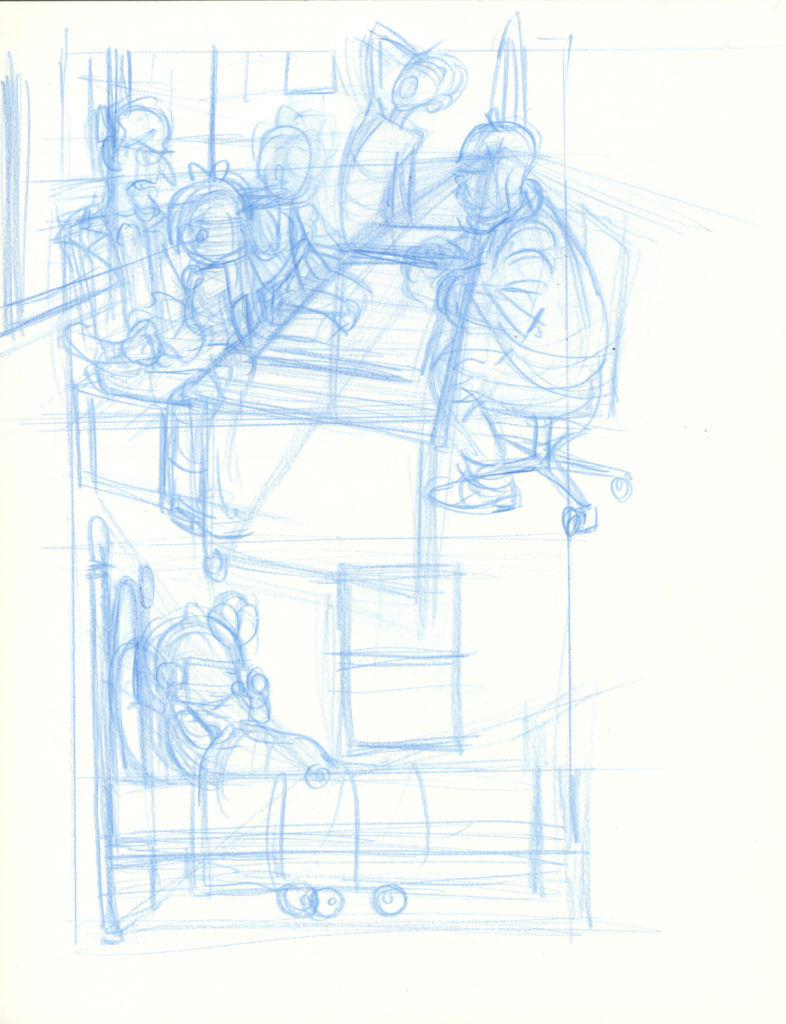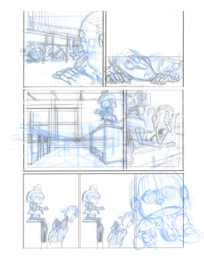 When we last left our heroes, they were pinned down by laser-shooting space baddies! And they still are!! I took three different passes at this scenario. Last week I showed the first page for all three takes. Here is how[…]↓ Read the rest of this entry…