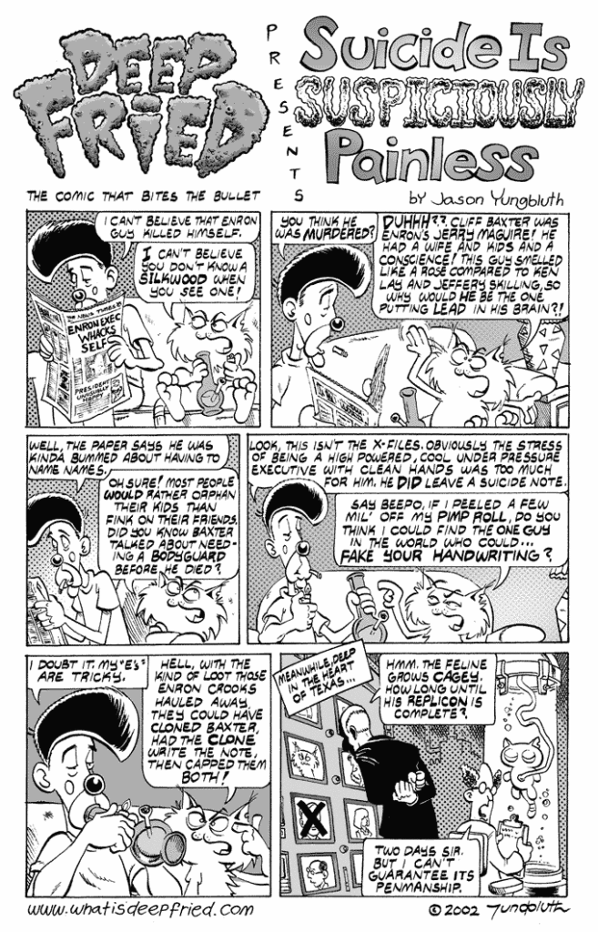 Suicide is Suspiciously Painless by JY on February 1, 2002 at 11:12 am Chapter: 1 Mixed Nutz └ Tags: Beepo, Deep Fried, Enron, Jason Yungbluth, Roadkill Comment