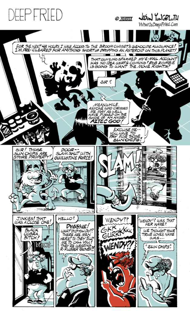 Sorry for the tardiness in my 10/8 update. All that sweet tenderness is hard to draw. I much prefer napalm enema art! Further in my defense, I had to journey to my hometown of Buffalo, NY this past weekend to[…]↓ Read the rest of this entry…