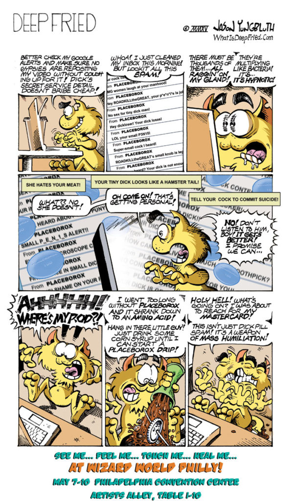 Out of the Frying Pan 19 by JY on April 20, 2015 at 12:00 am Chapter: 10 Frying Pan └ Tags: hypnosis, Placeborox, Roadkill, Spam, Subway, Viagra 2 Comments