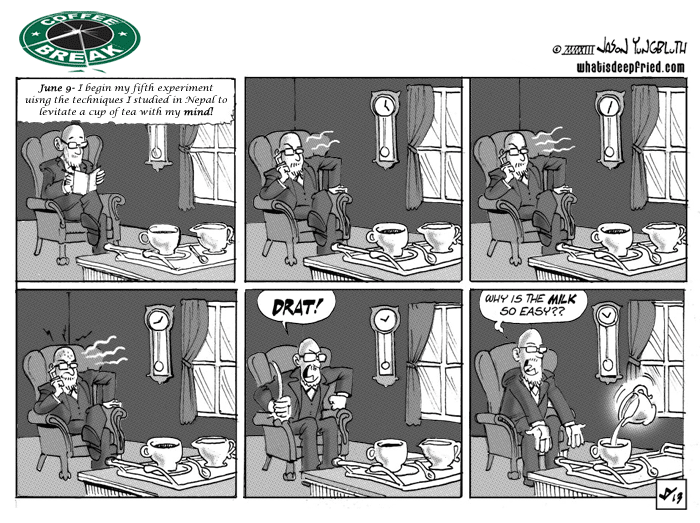 Coffee Break: Telekiwhatsis by JY on August 2, 2013 at 12:00 am Chapter: COFFEE and CREAM └ Tags: comic, Comics, levitate, mental power, Nepal, professor, tea, telekinesis, yungbluth 1 Comment