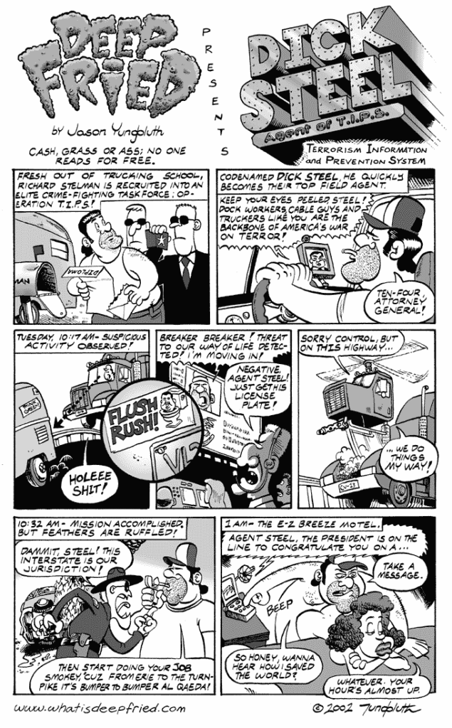 Dick Steel by JY on August 1, 2002 at 11:28 am Chapter: 1 Mixed Nutz └ Tags: Beepo, Deep Fried, Jason Yungbluth, Operation TIPS, Roadkill 3 Comments