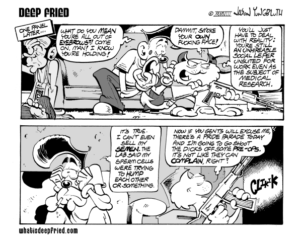 (Jason will be hard at work in the coming weeks drawing the cartoons that make the world smile. In the meantime, several of the web’s most popular cartoonists have agreed to let their comics run in place of Deep Fried. Enjoy!)