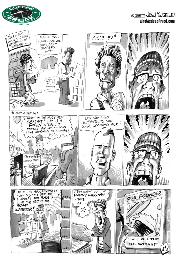 Coffee Break: Wegpocalypse Now by JY on December 20, 2013 at 12:00 am Chapter: COFFEE and CREAM └ Tags: adult diapers, apocalypse, road warrior, shopping, wegmans 4 Comments