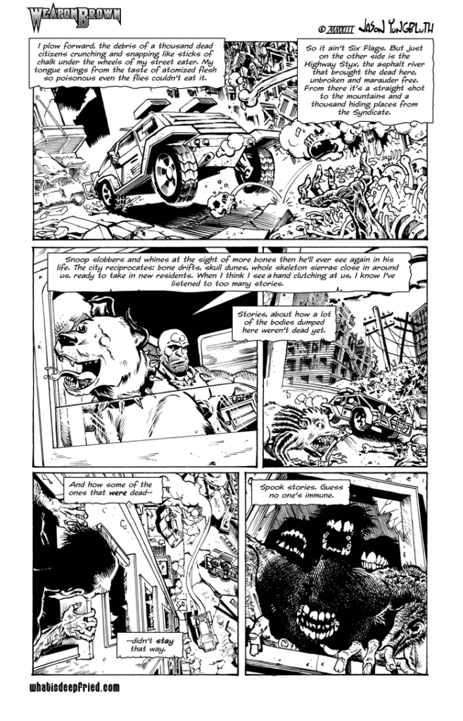 Weapon Brown 38 by JY on March 26, 2013 at 12:00 am Chapter: 3 Troglodytes └ Tags: Barney Baxter, Bone City, Chuck, mutants. B.C., street eater, trogs, Weapon Brown 6 Comments