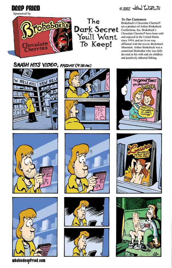 Laura by JY on March 6, 2006 at 11:51 am Chapter: 1 Mixed Nutz └ Tags: Beepo, Deep Fried, Jason Yungbluth, Roadkill, video rental 1 Comment